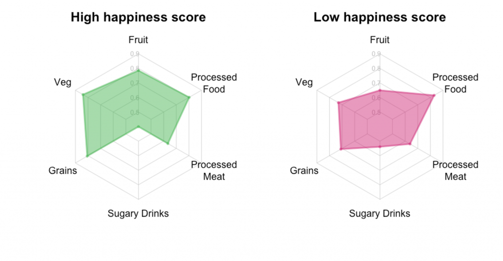 The graphs above show those in the Evergreen community with a high happiness score do tend to have a healthier diet. For example, they eat more fruit and veg and don’t tend to drink many sugary drinks. Both groups eat around the same amount of processed food.†