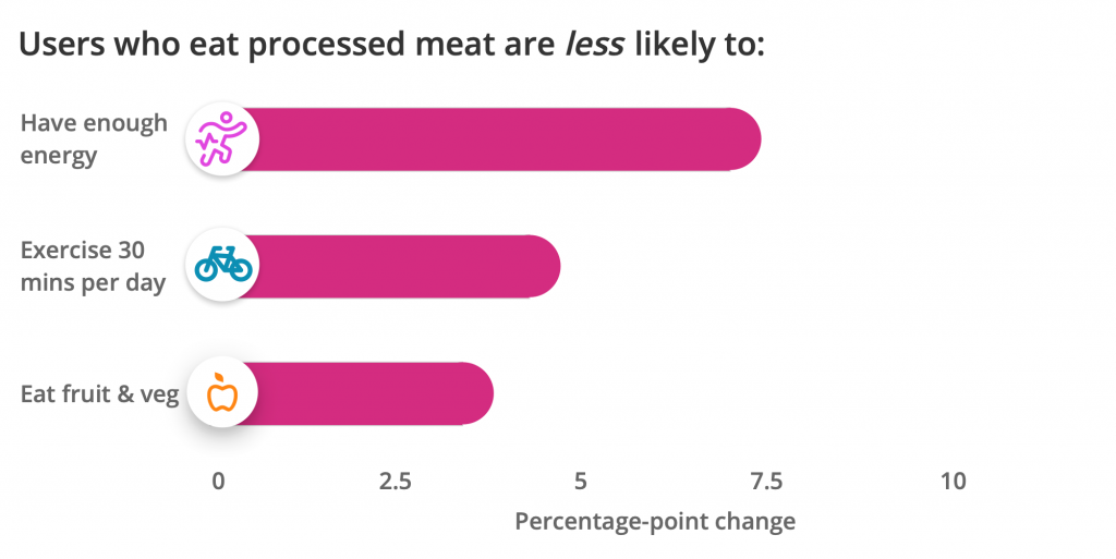 The graph above shows how eating processed meat is linked to a variety of factors. For example, users in our community who eat processed meat are less likely to eat fruit and veg and are more likely to be overweight.§