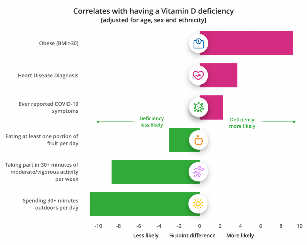 Keeping your Vitamin D levels up will help you stay as fit as possible during COVID, so we’ve been asking our users about their lifestyle to look at what factors are associated with vitamin D deficiency.